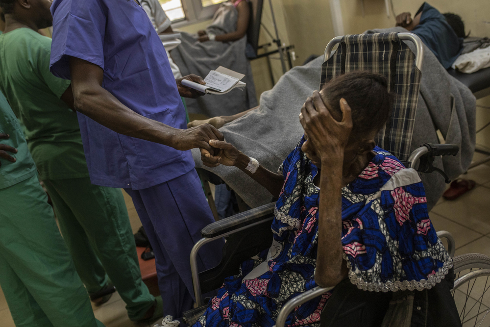 Claudette* lleva semanas a los pies de la cama de su hijo en el CHK. Patrick*, de 36 años, es seropositivo y tiene tuberculosis, la infección oportunista más común entre los pacientes con VIH.