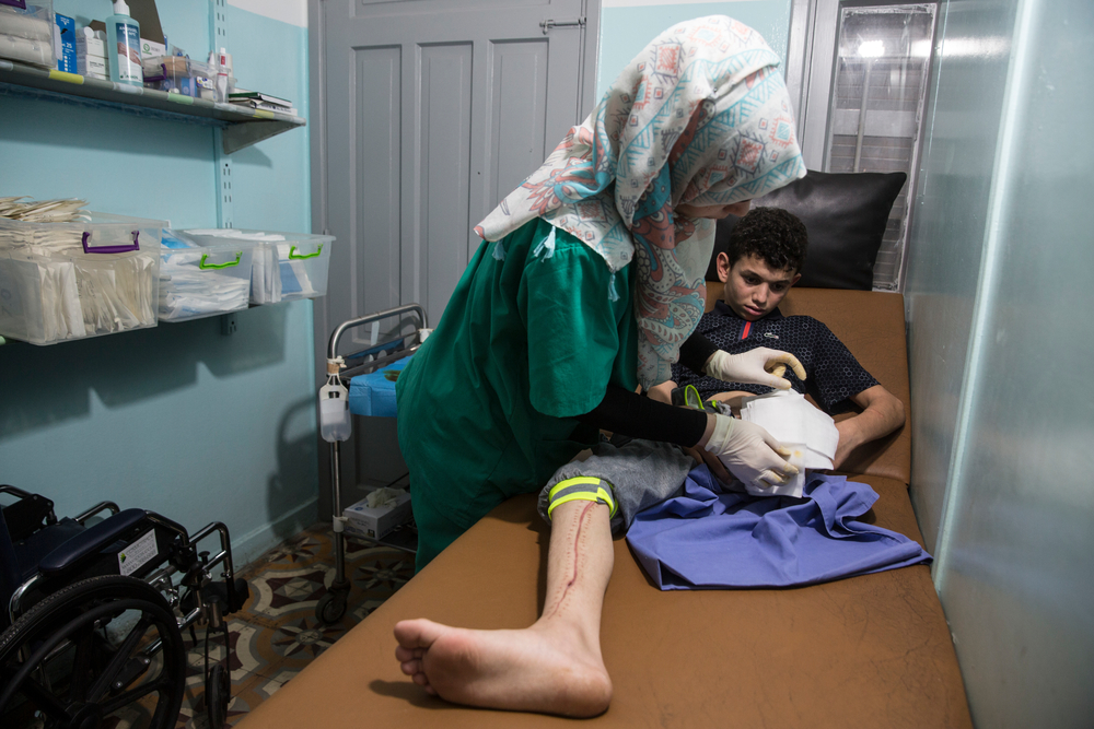 "Cuando me dispararon, no sentí nada al principio", dice Raed Bordini, de 24 años, del campo de Al Maghazi. "Hubo un destello de algo así como electricidad, me senté de repente y descubrí que no podía moverme. Traté de levantarme, pero no pude. Estaba sangrando mucho y tuve miedo de los efectos en la pierna porque estaba abierta, desde atrás hacia adelante". Raed acude a la clínica varias veces a la semana para cambiar sus vendajes. Su fijador externo está puesto todavía. "Estoy sufriendo mucho", dice. "Tomo muchas cosas como ibuprofeno y paracetamol, pero no tiene ningún efecto. Tengo miedo de que mi pierna no vuelva a funcionar. Me asusta que no pueda soportarlo, puedo ver que no está bien".