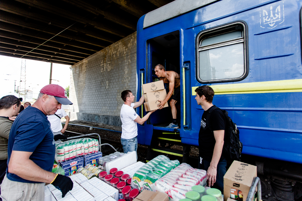 Un depósito enorme dentro de una estación de tren está lleno de donaciones de organizaciones grandes y pequeñas: cajas marrones llenas de comida enlatada enviadas desde una pequeña escuela en Inglaterra se encuentran junto a una pared de cajas blancas bien marcadas de una de las ONG internacionales más grandes. El grupo carga las donaciones directamente en los trenes que se dirigen al campo, donde alrededor de 100 grupos comunitarios diferentes las recogerán y las distribuirán a sus habitantes, en su mayoría personas mayores.