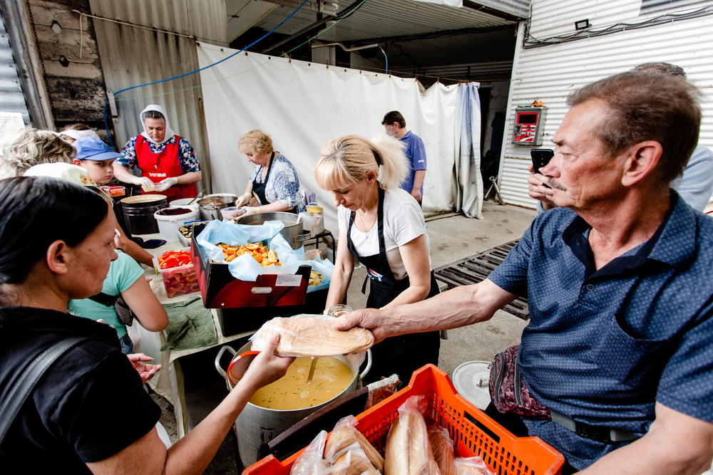Zakharov hace un seguimiento de las necesidades que ve en su comunidad. En estos días, cuando Médicos Sin Fronteras determina que el vecindario es lo suficientemente seguro, un médico y un psicólogo del equipo ofrecen sus servicios en la parte delantera del restaurante mientras el equipo de enfermería voluntario administra infusiones a pacientes con cáncer en una habitación, y las y los voluntarios de la comunidad cocinan alimentos para unas 1,200 personas diariamente en la cocina, que se encuentra en la parte de atrás.