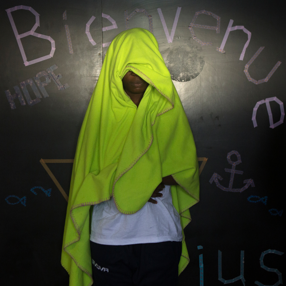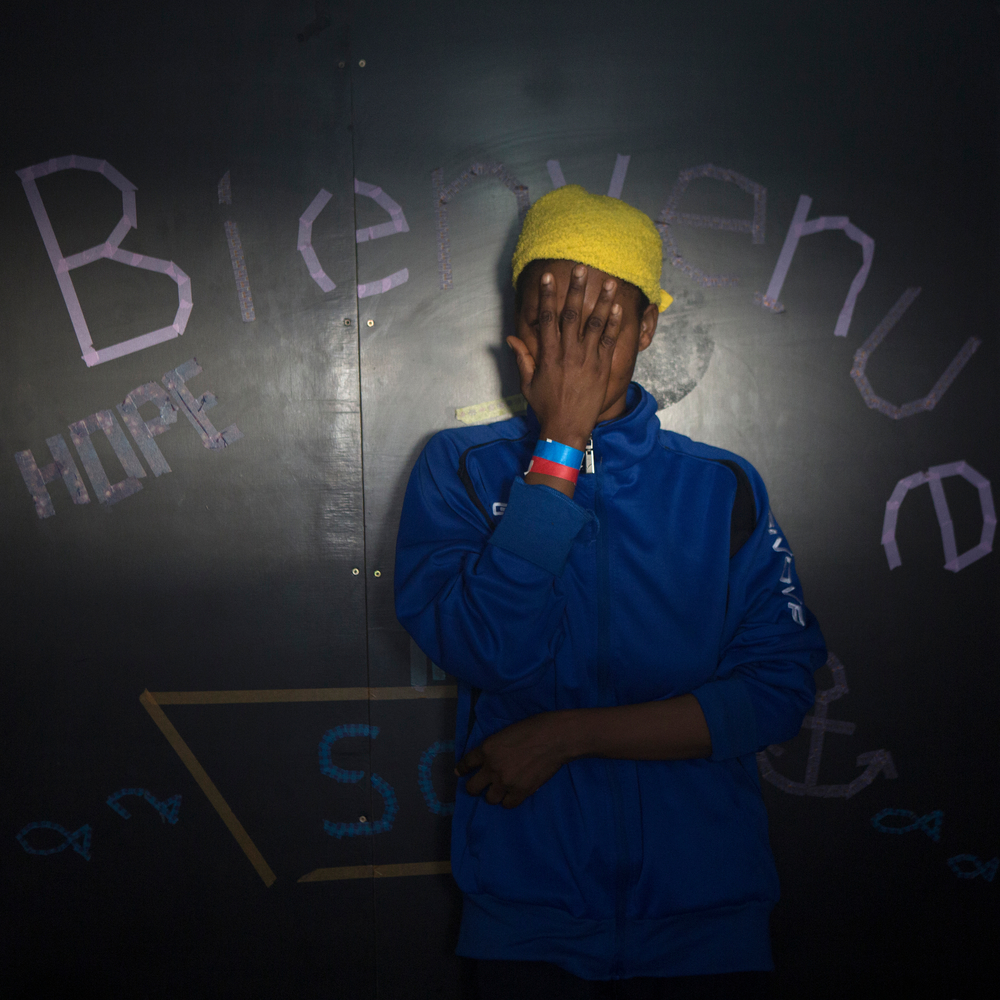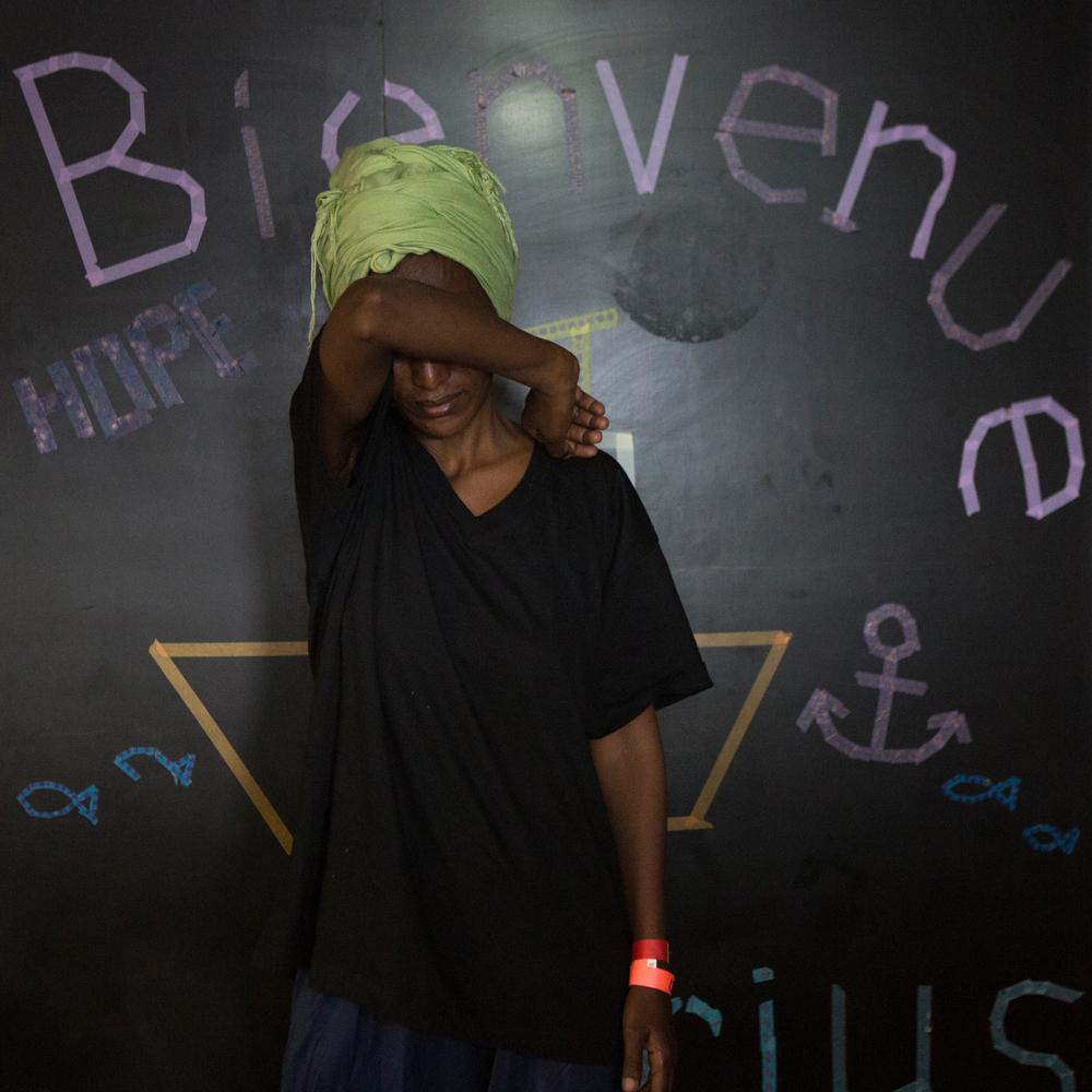 “En nuestro país hay muchos problemas por culpa de los presidentes. La policía te detiene, las peleas, vienen a tu casa… la gente te golpea… yo huí con mi hermana mayor. Mi hermano mayor está en prisión desde hace cinco años, él mismo me dijo de partir. Fuimos a tomar un autobus y perdí a mi hermana al principio del viaje. No sé dónde está. Yo seguí. Tomé el autobus hasta Agadez y luego estaba en Libia. Me encontré en una habitación donde no tenía para comer y me golpeaban. Me dijeron que llamara a mi madre para pedirle dinero, pero les dije que mi madre no tiene dinero, y me golpearon. Luego un hombre me ayudó a salir y me encontré en un bote hacia Europa. No sé cuánto pagó por mi viaje, pero me dijo que tengo que se lo tengo que reembolsar cuando llegue a Europa. Pasamos toda la noche en el agua, no había visto el agua, tenía mucho miedo. Luego vimos al Aquarius y pensé que finalmente iba a encontrar un lugar donde las personas no te golpean y donde puedes trabajar. Yo puedo hacer todo tipo de trabajos.”