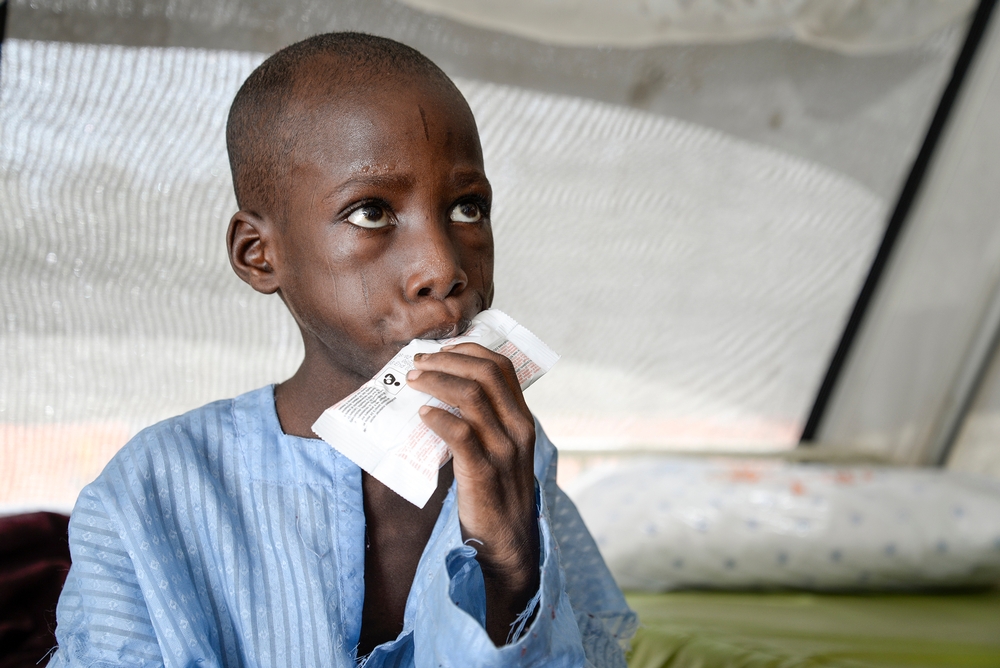 Por ejemplo, recientemente vino una madre a uno de nuestros centros de salud con su hija de siete años. La niña estaba muy desnutrida y tenía diarrea. Inmediatamente la hospitalizamos en nuestro centro de alimentación para pacientes internos. Cuando la mirabas, no se reía, no sonreía. La madre nos dijo que huían de un pueblo al este de Maiduguri, sin el padre. Se instalaron en Muna Garage, un campamento improvisado en las afueras de la ciudad. Se quedaron allí por más de un mes, pero las raciones de mijo y arroz que recibieron eran demasiado pequeñas, y no tenían dinero para acudir a las instalaciones de salud estatales.