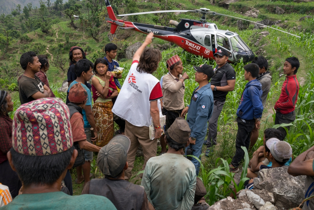 - Desde el 29 de abril los equipos médicos de Médicos Sin Fronteras (MSF) en Nepal han comenzado a llegar a las personas aisladas en las aldeas repartidas en las montañas, ya sea en helicóptero o a pie. Los distritos de Dhading, Gorkha, Rasuwa y Sindhupalchowk fueron duramente golpeados y poca o ninguna ayuda ha llegado aún a muchos poblados.