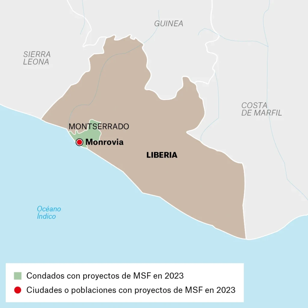 Nº de profesionales * de MSF en 2023: 88 | Gastamos 3,8 millones de € | MSF trabajamos por primera vez en Liberia en 1990
