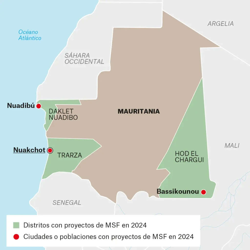Nº de profesionales * de MSF en 2023: 2 | Gastamos 0,6 millones de € | MSF trabajamos por primera vez en Mauritania en 1994