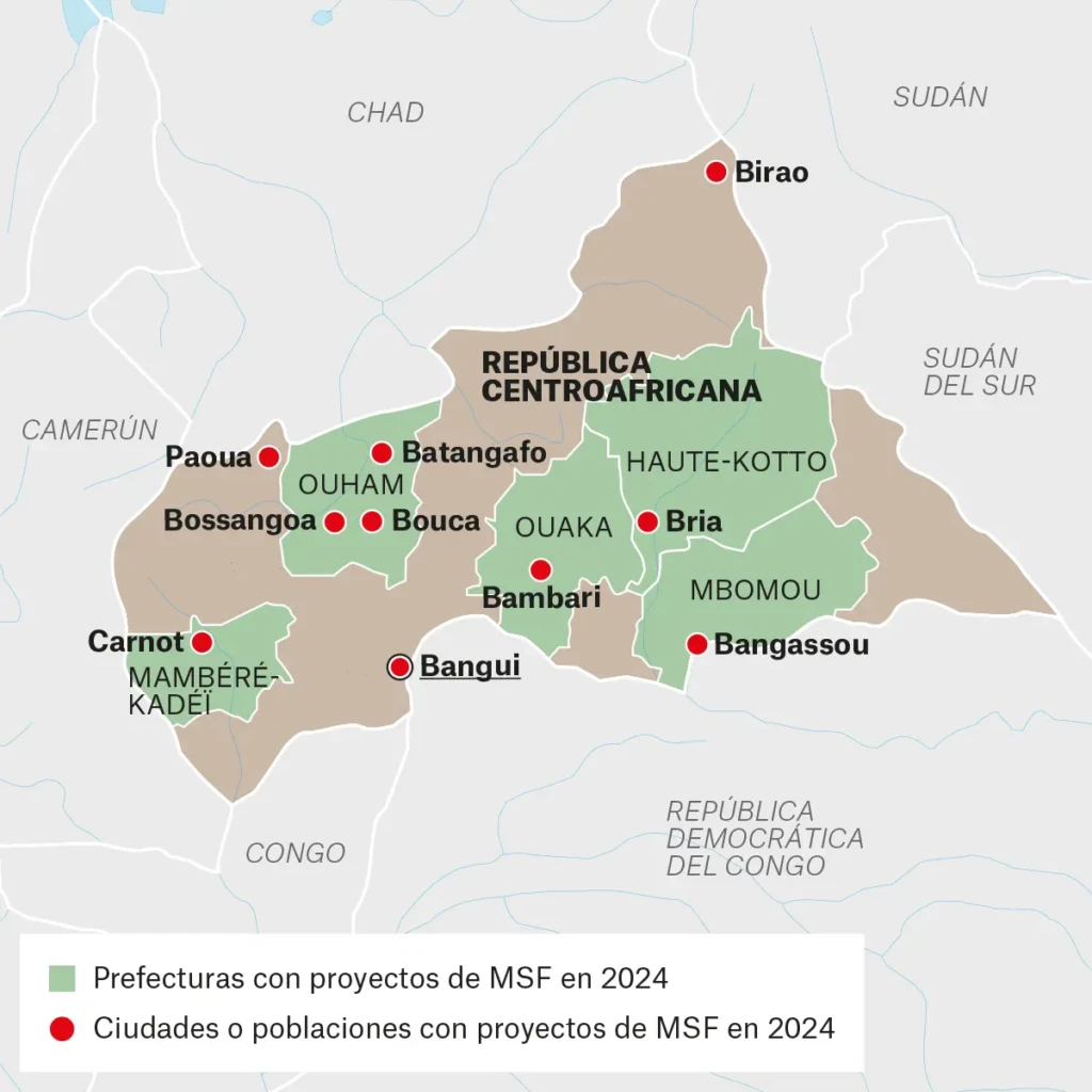 Durante 2024, nuestros equipos pusieron en marcha respuestas de emergencia para ayudar a las personas refugiadas de los vecinos Sudán y Chad. Entre ellas se incluyen servicios generales de atención médica y campañas de vacunación para contener los brotes de sarampión y tos ferina. En zonas con altas tasas de mortalidad materna, MSF reforzamos los servicios de atención médica materna para garantizar que las embarazadas recibieran atención prenatal esencial.