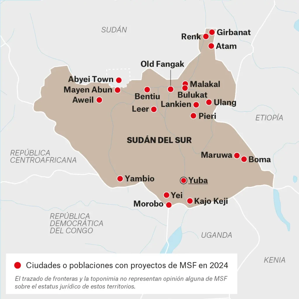 A lo largo de 2024, Médicos Sin Fronteras dirigimos 12 proyectos habituales y 5 proyectos de emergencia en Sudán del Sur en los que prestamos diversos servicios, como atención médica general y especializada y apoyo en salud mental.